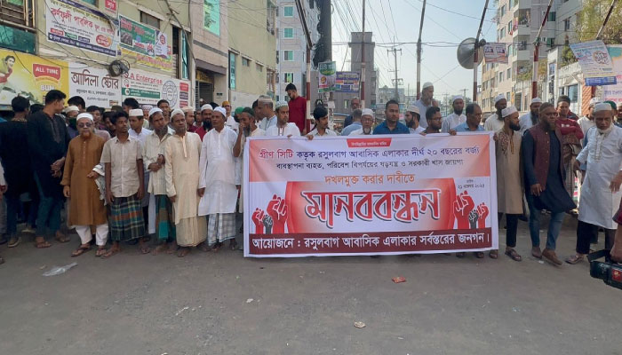 চট্টগ্রাম নগরের রসূলবাগ আবাসিক এলাকার দুই দশকের বর্জ্য ব্যবস্থাপনা ব্যাহত হওয়া, পরিবেশ বিপর্যয়ের আশঙ্কা এবং সরকারি খাসজমি দখলমুক্ত করার দাবিতে রসূলবাগে অনুষ্ঠিত হলো এক শান্তিপূর্ণ মানববন্ধন।