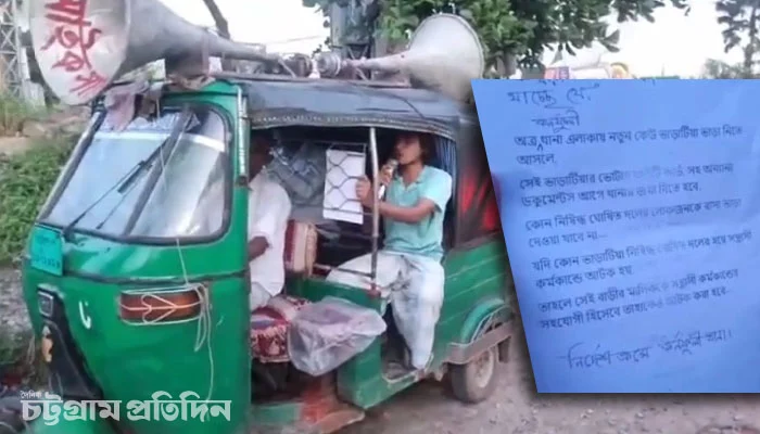 ভিডিওতে দেখা যায়, লুঙ্গি ও জার্সি পরা এক যুবক সিএনজি অটোরিকশায় মাইকিং করে ঘোষণা দিচ্ছেন— পরিচিত ভাড়াটিয়া না হলে এবং সঠিক কাগজপত্র ছাড়া কাউকে যেন বাসা ভাড়া দেওয়া না হয়।